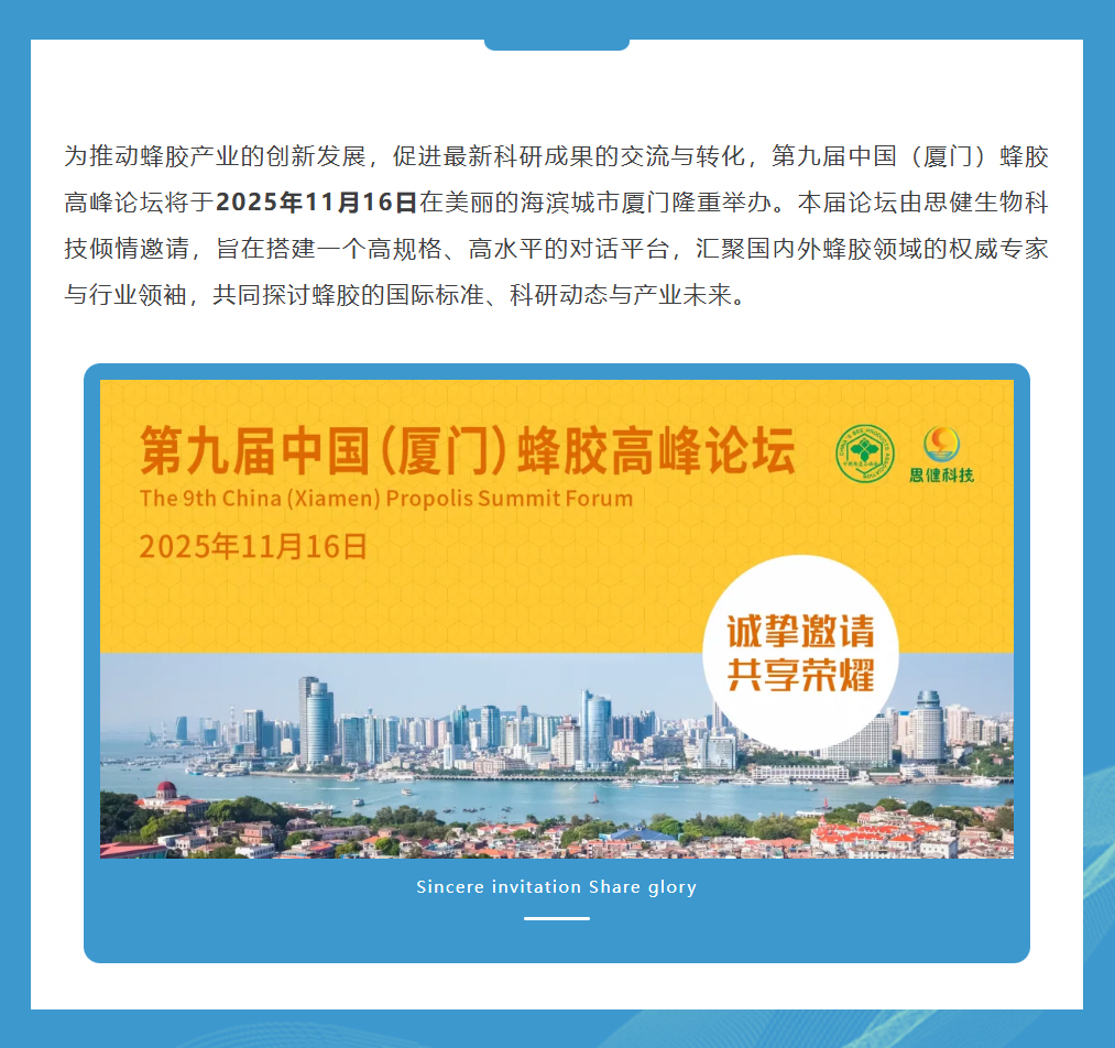 思健生物科技誠(chéng)邀您共赴廈門(mén)出席第九屆中國(guó)(廈門(mén))蜂膠高峰論壇:與蜂業(yè)權(quán)威面對(duì)面,洞見(jiàn)蜂膠國(guó)際新未來(lái)